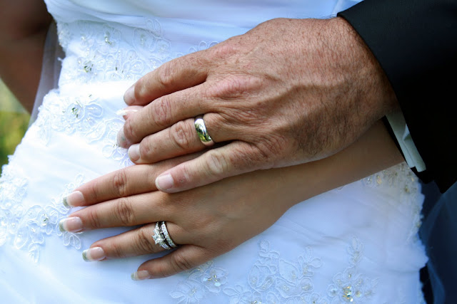 I had over 450 photos yesterday to choose from, not bad for 3 hours worth of wedding photography. With all that material I decided not to stick with the theme of "favorite electronic" for today. While I also do the more traditional showing of the wedding rings on the bride's bouquet I like this version better when the wedding dress has such pretty detail work on it.